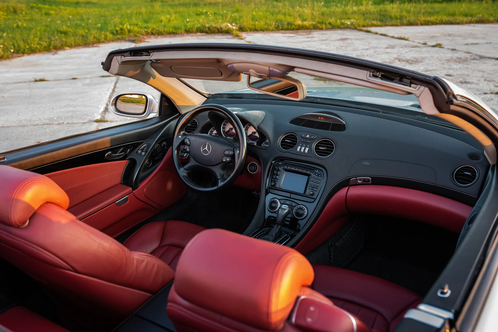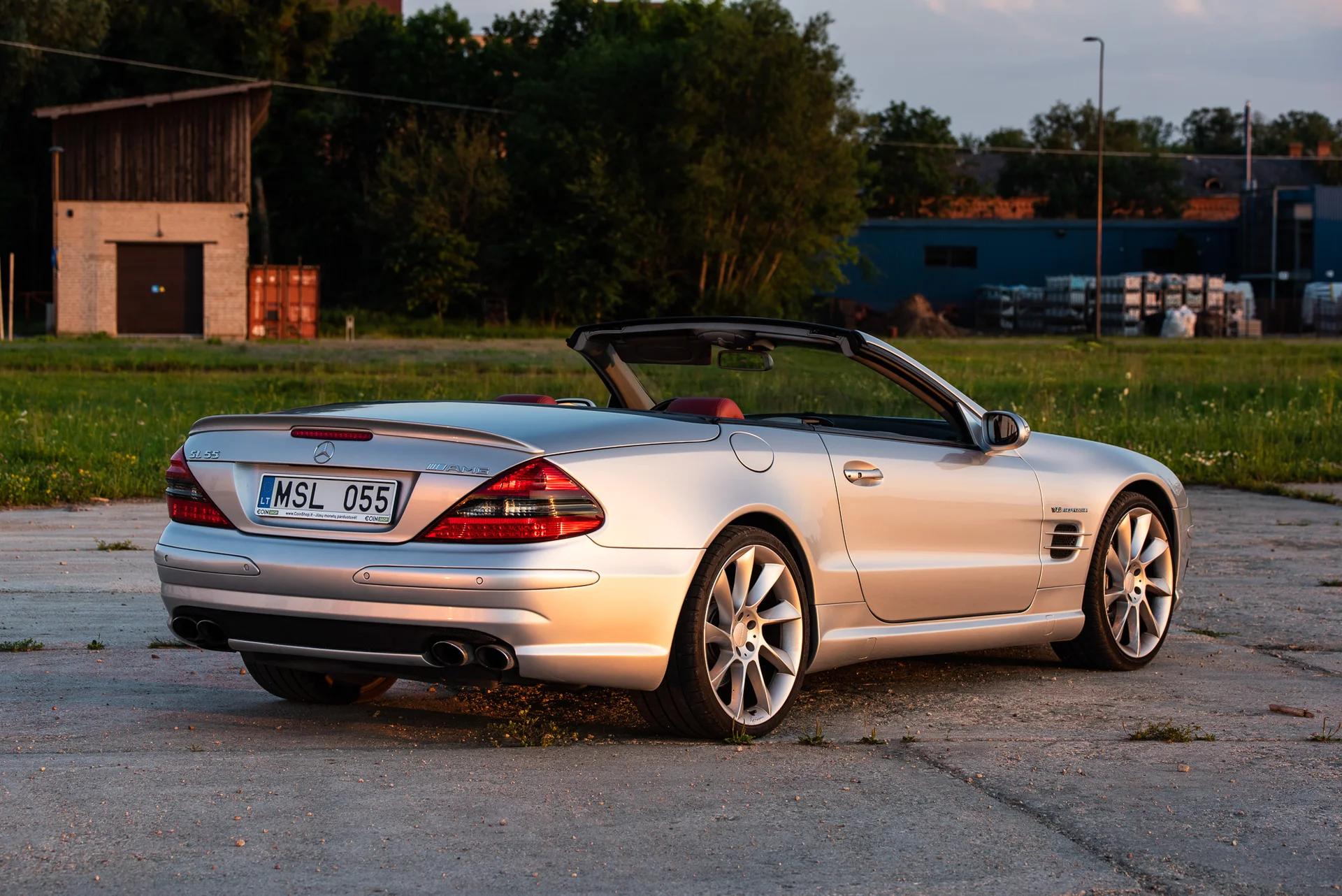 Mercedes-Benz SL55 AMG 2003 nuoma be vairuotojo – klasikinis supercharged V8 roadsteris iš 2000-jų fotosesijoms.