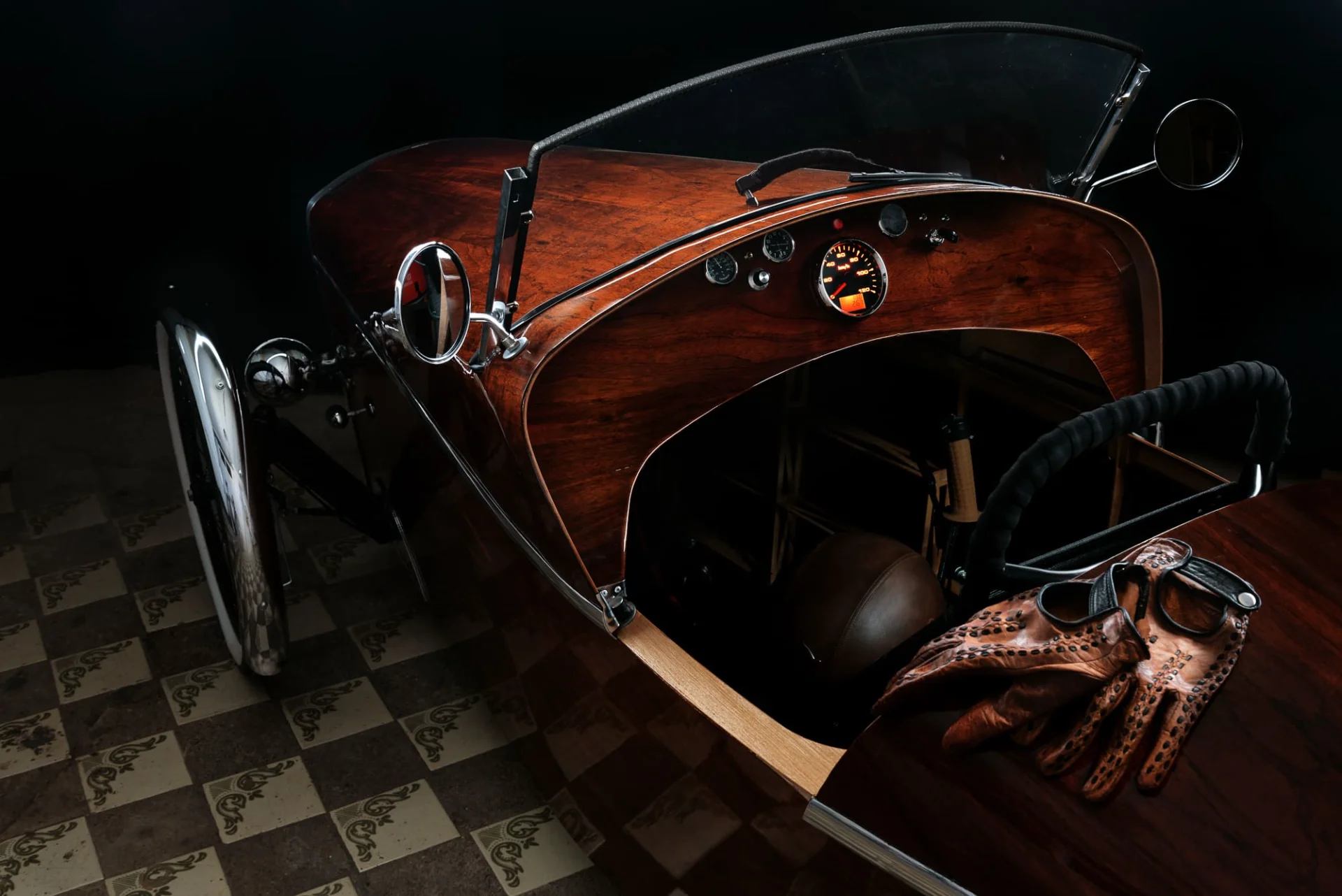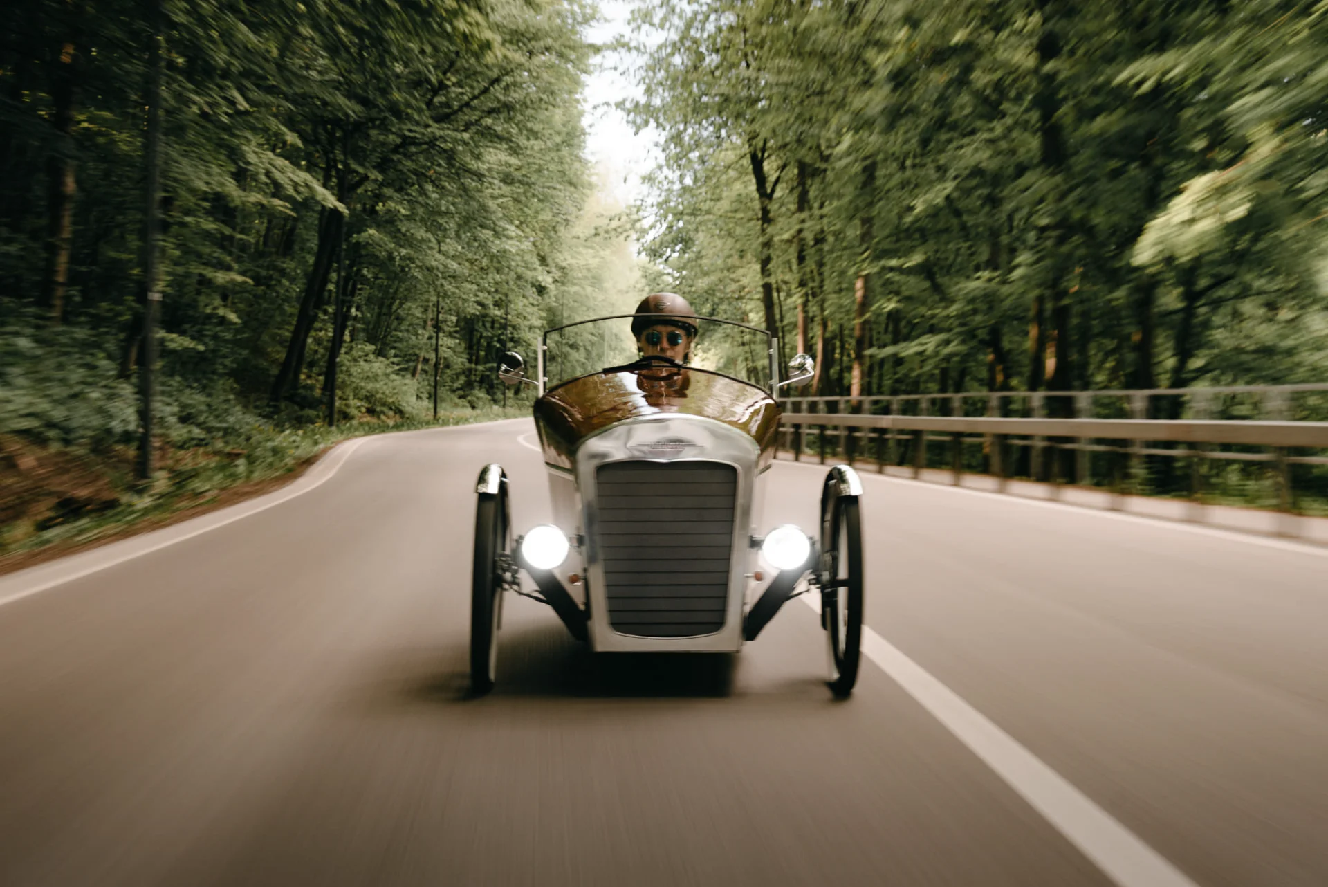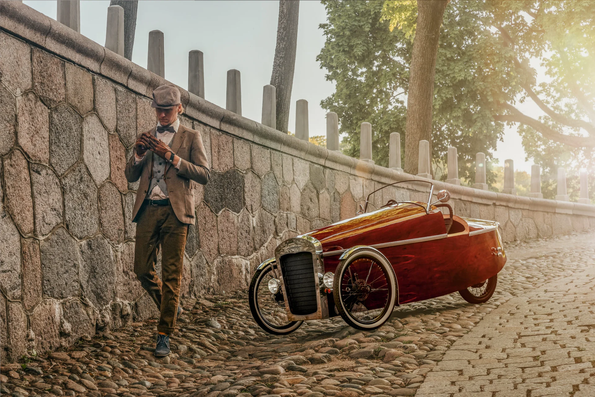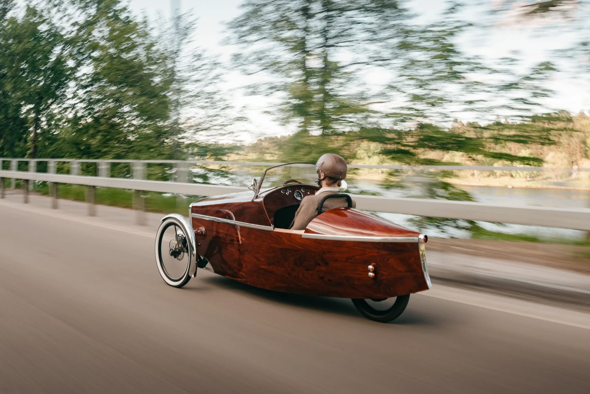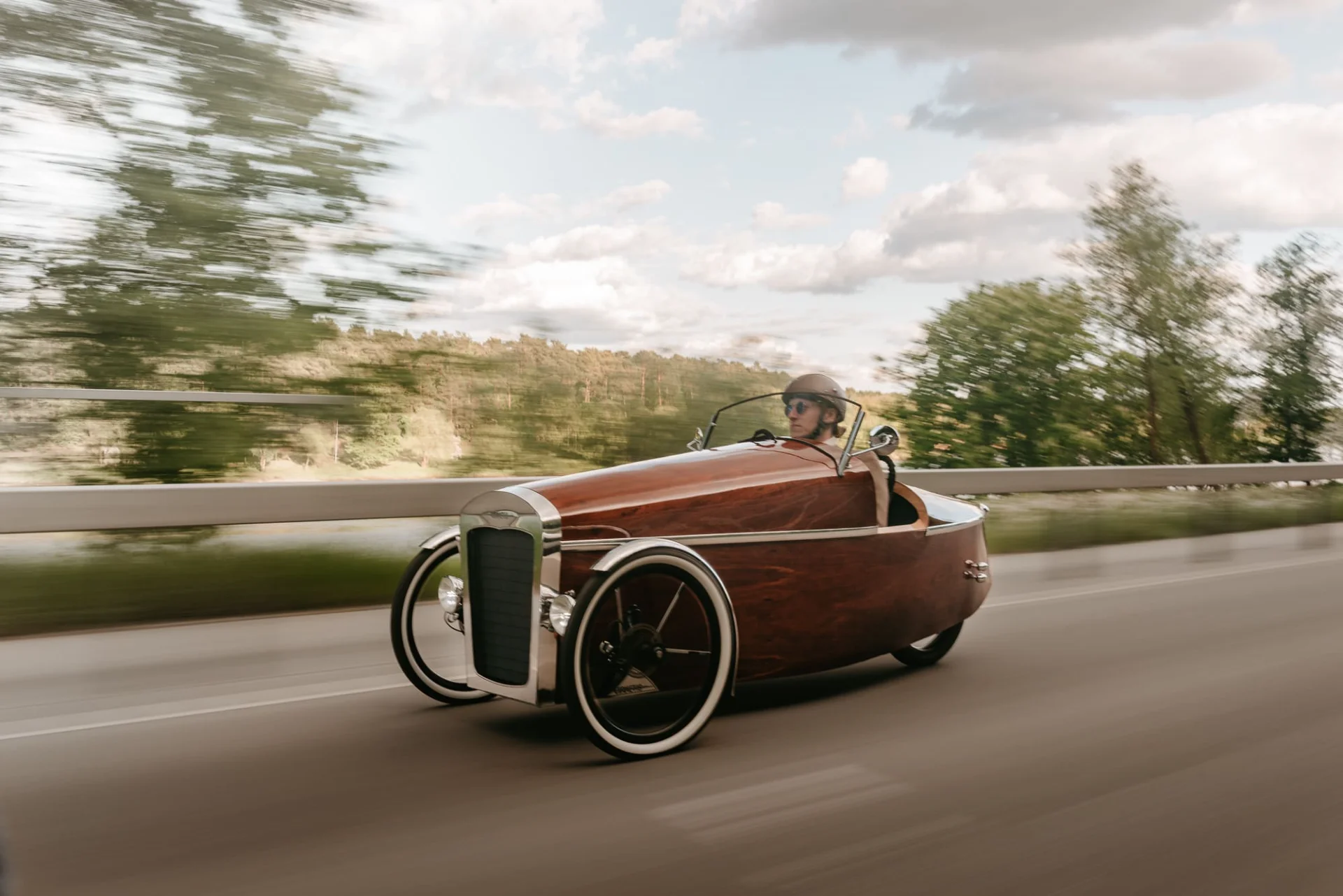 Šis unikalus velomobilis – tai išskirtinis rankų darbo kūrinys. Įkvėptas hotrodų, Morgan triračių ir raudonmedžio jachtų dizaino, velomobilis išsiskiria savo stiliumi ir techniniu sprendimu. Jis sukurtas naudojant gulimąjį triratį kaip donorą ir keičiant konstrukciją iš esmės, išorę dengia raudonmedžio fanera, turi elektrinę pavarą, bei minamas pedalais. Visas projektas užtruko devynis mėnesius – nuo idėjos iki gatavos transporto priemonės. Velomobilis varomas galiniu stebulės varikliu, o didelė baterija (3kw/h) leidžia įveikti iki 100 km vienu įkrovimu. Konstrukcija užtikrina komfortą net esant šaltesniam orui – viduje nėra skersvėjų, o priekinės grotelės valdomos troseliu, padeda išlaikyti šilumą, o vasaros metu ventiliuoja. Dizainas ne tik saugo nuo lietaus ir vėjo, bet ir traukia žvilgsnius kiekviename žingsnyje. Maksimalus greitis apribotas iki 25 km/h, kad atitiktų elektrinių dviračių reglamentus. Velomobilio neduodame pavairuoti, tačiau jis puikiai tinka renginiams, parodoms ar fotosesijoms – kaip unikalus, vienetinis meno kūrinys ant ratų, kuris tikrai pagyvins jūsų šventę ar viešą erdvę. Kaune ne mažiau 2val, kituose miestuose ne mažiau 4val. Atvežamas į bet kurį miestą. Galima sutarti dėl vairavimo jei bus naudojama filmuojant reklamas/muzikinius klipus.